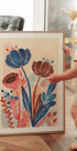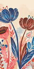Una vivace illustrazione botanica con vivaci fiori rossi, blu e nei toni della terra su uno sfondo morbido e strutturato. Il vivace mix di colori e forme organiche aggiunge calore e fascino: un pezzo perfetto per illuminare cucine, soggiorni o una moderna galleria a parete.