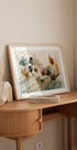 Questa opera d'arte mostra delicati fiori acquerellati in tonalità tenui su uno sfondo strutturato. La composizione eterea cattura la fragilità e l'eleganza della natura, rendendola perfetta per gli appassionati di arte floreale e per l'ispirazione per l'arredamento della casa.