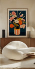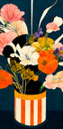 Un vivace bouquet di fiori in un estroso vaso a righe su uno sfondo scuro, con papaveri e fiori delicati. Quest'opera d'arte mette in risalto il design floreale contemporaneo con ricchi contrasti di colore, perfetti come ispirazione per l'arredamento moderno della casa.