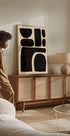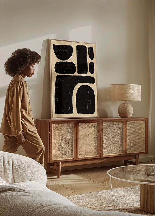 Un'opera d'arte astratta sorprendente con forme nere audaci su uno sfondo beige tenue. Le forme organiche e le pennellate strutturate creano un'estetica moderna e minimalista, perfetta per interni contemporanei, pareti di gallerie o per chiunque ami un design pulito ma artistico.