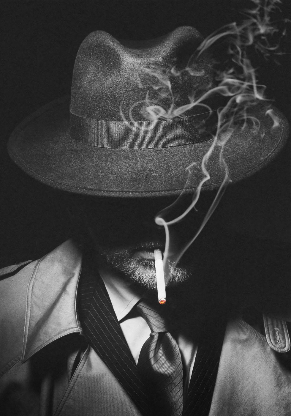 Un drammatico ritratto in bianco e nero di un uomo misterioso con un cappello fedora e un trench che esala fumo di sigaretta. Le luci e le ombre profonde creano un'atmosfera noir classica che ricorda i vecchi film polizieschi di Hollywood. Perfetto per gli amanti del film noir, dei gialli vintage e dei motivi cinematografici senza tempo.