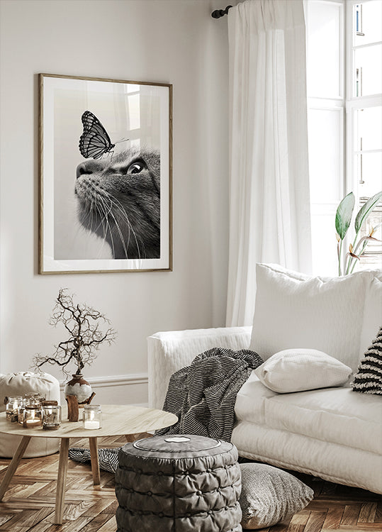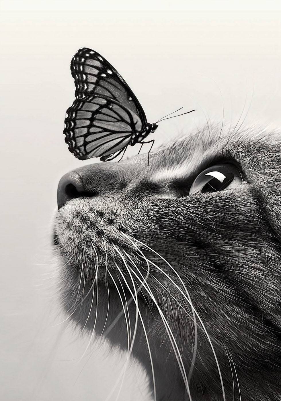 Una commovente immagine in bianco e nero che cattura un momento di curiosità tra un gatto e una farfalla. I grandi occhi del gatto e le delicate ali della farfalla creano una composizione artistica e rilassante. Perfetto per gli amanti degli animali e l'arredamento minimalista.