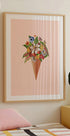 Un poster artistico surreale e giocoso con un bouquet di vivaci fiori vintage disposti in un cono gelato su un morbido sfondo rosa pesca. Combinando natura e nostalgia, questa opera d'arte collage unica è un pezzo perfetto per interni moderni, retrò ed eclettici.