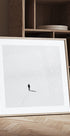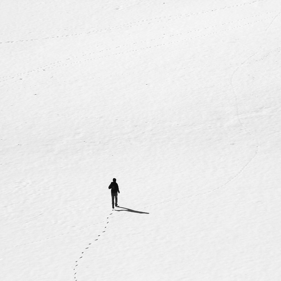Una poetica fotografia aerea in bianco e nero di un paesaggio innevato, dove una sola persona e le sue impronte tagliano il silenzio bianco. Le lunghe ombre e l'elevato contrasto creano una calma minimalista e un senso di immersione. Una composizione invernale senza tempo di MOSTAFA NODEH. Il motivo bilancia il silenzio e l'eccitazione in uno spazio grafico e innevato.