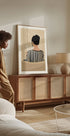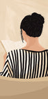 Un'illustrazione calda e invitante di una donna che legge da dietro con indosso un top a righe. I tenui toni del beige e l'atmosfera rilassata creano un'estetica rilassante, rendendolo il pezzo perfetto per camere da letto, soggiorni o angoli lettura, ideale per chi ama i momenti tranquilli e gli spazi accoglienti.
