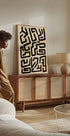 Un'opera d'arte astratta moderna con caratteristici tratti labirintici neri su un caldo sfondo beige. Le linee libere creano un senso di ritmo e movimento, rendendolo un pezzo accattivante per spazi contemporanei e interni minimalisti.
