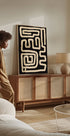 Un'audace opera d'arte astratta con linee beige tortuose su uno sfondo nero profondo che crea un effetto labirintico. Il forte contrasto e il design moderno lo rendono un elemento centrale sorprendente negli interni moderni, perfetto per aggiungere espressione grafica a un soggiorno, un corridoio o un ufficio.