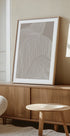 Un poster astratto minimalista con linee bianche organiche e fluide su uno sfondo beige tenue. I motivi fini e ritmici forniscono movimento e consistenza e combinano l'eleganza naturale con un design moderno. Perfetto per interni moderni che desiderano decorazioni murali tranquille in toni neutri.