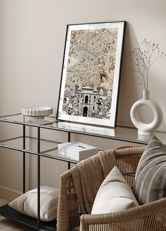 Un suggestivo poster di Madrid di Simon Goggin che cattura il polso della città in un collage retrò. Una mappa dettagliata della città si intreccia con motivi iconici come Plaza de Toros, matador e scene classiche della città. Colori caldi e saturi di sole e forme grafiche creano un tributo vivente alla capitale della Spagna. Perfetto per gli amanti dei viaggi, della cultura e della grafica.