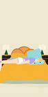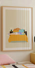 Un'illustrazione divertente e minimalista di una donna sdraiata esausta su un letto con la testa appoggiata su un laptop. Questa opera d'arte giocosa cattura il moderno stile di vita digitale e l'equilibrio tra riposo e produttività, rendendola un'aggiunta divertente agli spazi moderni.