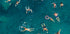 Una colorata veduta aerea di persone che nuotano e galleggiano in acque turchesi cristalline. Questa vivace scena estiva cattura la gioia del tempo libero, della libertà e del ristoro sotto il sole. Perfetto per evocare l'atmosfera vacanziera e il relax costiero.
