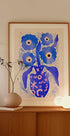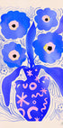 Un omaggio audace e giocoso a Matisse, con un vivace vaso pieno di sorprendenti fiori blu su uno sfondo chiaro. Il design combina motivi grafici con elementi floreali e crea una natura morta vivace e moderna, ideale per interni contemporanei.