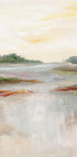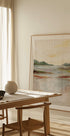 Un dipinto di paesaggio morbido ed evocativo con pennellate calme e colori tenui. Questa immagine astratta del paesaggio acquatico unisce terra, acqua e cielo in un orizzonte pacifico che evoca sentimenti di calma e contemplazione. Un'opera d'arte perfetta per aggiungere un'atmosfera rilassante e ispirata alla natura a qualsiasi stanza.