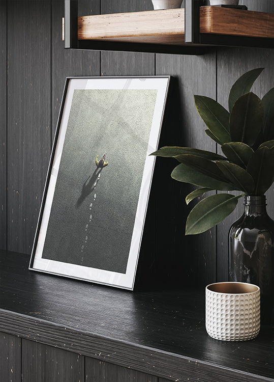 Un'immagine in movimento di un uomo che avanza, lasciando impronte dietro di sé. La luce zenitale e l'ombra suggestiva enfatizzano il tema del lasciare un segno, del procedere, e l'esperienza umana del viaggio e del cambiamento.