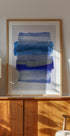 Un rilassante poster astratto con pennellate orizzontali stratificate nei toni del blu e del grigio su uno sfondo bianco puro. La trama pittorica e le transizioni morbide creano un senso di calma e profondità, perfetto per interni moderni, decorazioni scandinave o pareti di gallerie minimaliste.