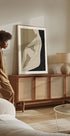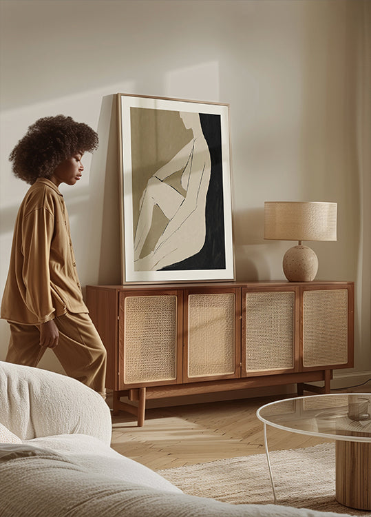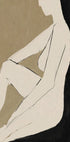 Un'opera d'arte astratta calma e minimalista che mostra una forma femminile seduta in toni tenui. Con pennellate pittoriche e semplicità moderna, l'opera esprime calma e relax, ideale per interni moderni e decorazioni artistiche murali.