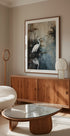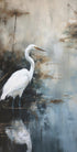 Questa tranquilla opera d'arte raffigura un airone bianco vicino a un ruscello a specchio, circondato da una vegetazione lussureggiante e avvolta dalla nebbia. La scena pacifica evoca un senso di calma e bellezza naturale, evidenziando l'eleganza della fauna selvatica nel suo habitat naturale.