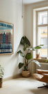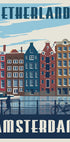Cattura l'atmosfera di Amsterdam con un elegante poster di viaggio: case colorate sui canali con timpani classici si riflettono nell'acqua, una bicicletta è appoggiata sulla ringhiera del ponte e piccole barche scivolano sotto un morbido cielo serale. Grafico, minimalista e iconico: un eye-catcher che porta a casa il fascino della grande città. Il titolo AMSTERDAM è chiaramente visibile come testo grafico.