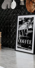 Un sorprendente poster in bianco e nero con la parola "COFFEE" combinata con un primo piano di una macchina per caffè espresso che versa il caffè fresco in una tazza. Perfetto per le pareti della cucina, le caffetterie o i bar, questo design tipografico minimalista combina l'ispirazione con un'elegante estetica monocromatica.