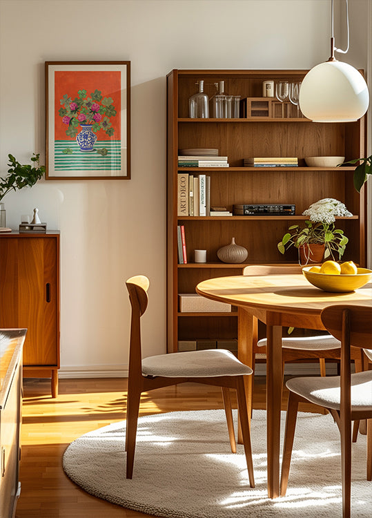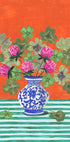 Un'opera d'arte colorata di natura morta con un vaso di porcellana blu pieno di fiori rosa e quadrifogli verdi, su uno sfondo arancione intenso. La tovaglia a righe crea un giocoso contrasto, rendendo questo pezzo una vivace dichiarazione decorativa. Perfetto sia per gli amanti della botanica che dell'arte moderna.