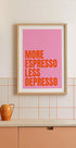 Luminoso, audace e divertente: questo poster tipografico moderno presenta la frase giocosa "More Espresso Less Depresso" in grassetto arancione su sfondo rosa. Una perfetta combinazione di motivazione e divertimento, ideale per cucine, uffici o angoli caffè. Perfetto per gli amanti del caffè con senso dell'umorismo.