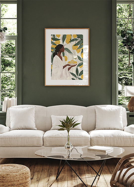 Un'opera d'arte elegante e moderna che raffigura una donna aggraziata in un limoneto, con in mano una ciotola di limoni freschi. Il giallo chiaro dei frutti contrasta splendidamente con il verde lussureggiante delle foglie, creando una composizione calma ed elegante per la casa o l'ufficio.
