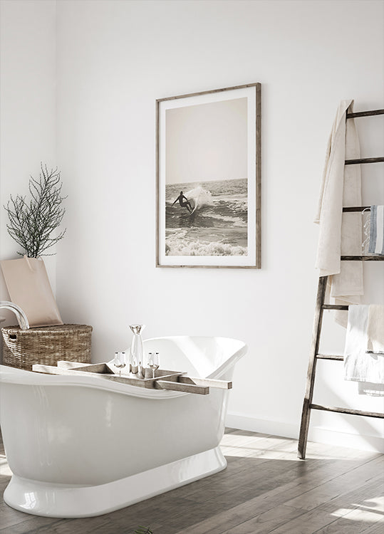 Una splendida fotografia in tonalità seppia di un surfista che solca le onde con un equilibrio perfetto. Il movimento del mare e gli spruzzi dinamici dell'acqua creano un senso di avventura e libertà. Ideale per i surfisti e il design degli interni di ispirazione costiera.