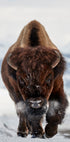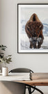 Una potente fotografia naturalistica di un bisonte che carica nella neve. Con il respiro gelido e la neve sul viso, questa immagine drammatica cattura la forza pura, la resistenza e la presenza maestosa di uno degli animali più iconici del Nord America.
