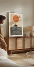 Un'illustrazione minimalista di una figura solitaria in una piccola barca che galleggia su onde nere e fluttuanti sotto un forte sole arancione. Le linee pulite e i toni caldi creano un'atmosfera calma e premurosa, un pezzo ideale per gli spazi moderni che abbracciano la calma e la semplicità.