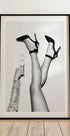 Un'elegante fotografia di moda in bianco e nero che cattura tacchi alti, champagne ed eleganza giocosa. Il contrasto minimalista crea un'atmosfera di festa audace, perfetta per interni moderni e decorazioni murali ispirate alla moda.