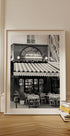 Un'affascinante fotografia in bianco e nero del caffè parigino La Marquise, con la sua tenda a strisce, le sedie da bistrot e l'atmosfera di strada senza tempo. Questa stampa cattura la cultura del caffè francese e porta un autentico tocco parigino in casa, evocando il romanticismo della vita quotidiana nella Ville Lumière.