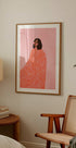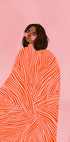 Una donna avvolta in un mantello fluido e vivace con motivi arancioni su uno sfondo rosa tenue. Questa illustrazione contemporanea cattura calore e stile con un'espressione minimalista e astratta, perfetta per gli amanti dell'arte contemporanea in cerca di ispirazione.