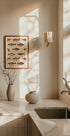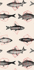 Un poster d'arte moderna con illustrazioni dettagliate di pesci combinate con forme geometriche rosse. La ripetizione e la simmetria creano un motivo unico che unisce la natura con la geometria astratta, rendendolo un sorprendente pezzo di arte murale moderna.