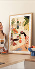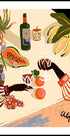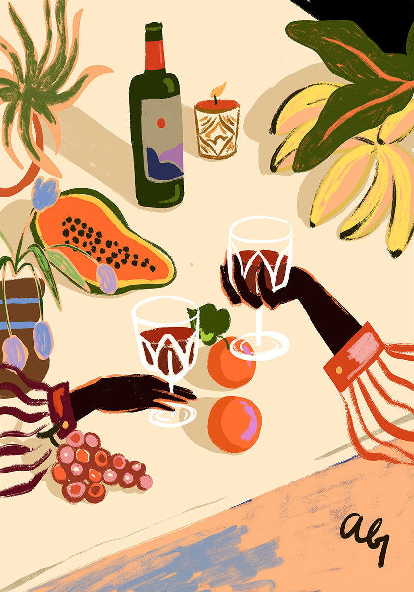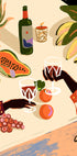 Un'illustrazione colorata di una natura morta di ispirazione tropicale, con le mani che tostano bicchieri di vino tra frutta fresca, fiori e piante. Con colori forti e dettagli giocosi, l'opera cattura il calore della socializzazione e della vita legata alla birra e diventa una dichiarazione vivace ed elegante.