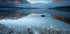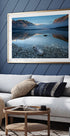 Un poster paesaggistico sereno del Lago di Bohinj in Slovenia, dove le acque immobili rispecchiano le montagne e la nebbia. La costa chiara con sassi e un tronco d'albero esalta l'atmosfera calma e armoniosa, ideale per creare pace e tranquillità in ogni spazio.