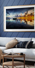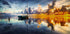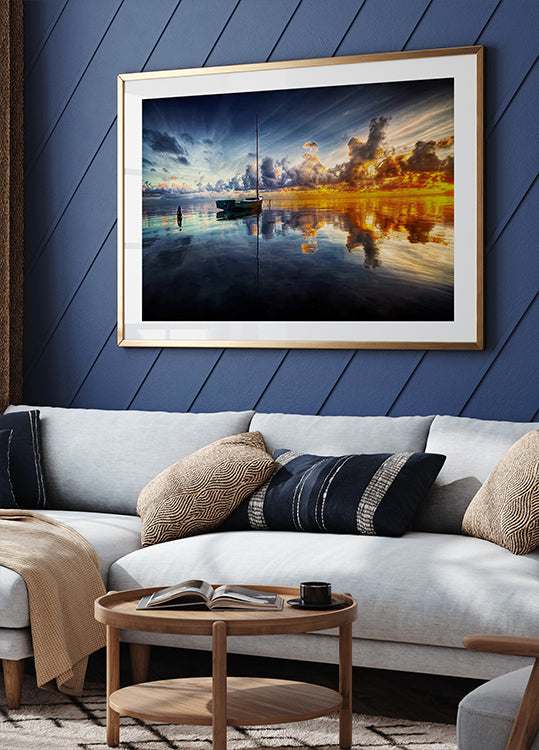 Questo paesaggio marino mozzafiato cattura una barca a vela solitaria appoggiata su acque calme sotto un drammatico cielo al tramonto. I riflessi delle nuvole dorate si increspano sulla superficie dell'acqua, unendo tranquillità e grandiosità, creando un'opera d'arte marittima senza tempo che trasuda pace, tranquillità e bellezza naturale.