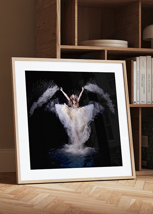 Powder Rush di Pauline Pentony cattura il momento in cui una ballerina esplode in movimento, circondata da un nubifragio di polvere che forma ali angeliche. Lo sfondo scuro e drammatico eleva la figura luminosa, mentre il salto, il vestito e lo spolvero di piume creano poesia, potere e avventura. Un ritratto moderno e avventuroso.