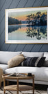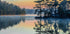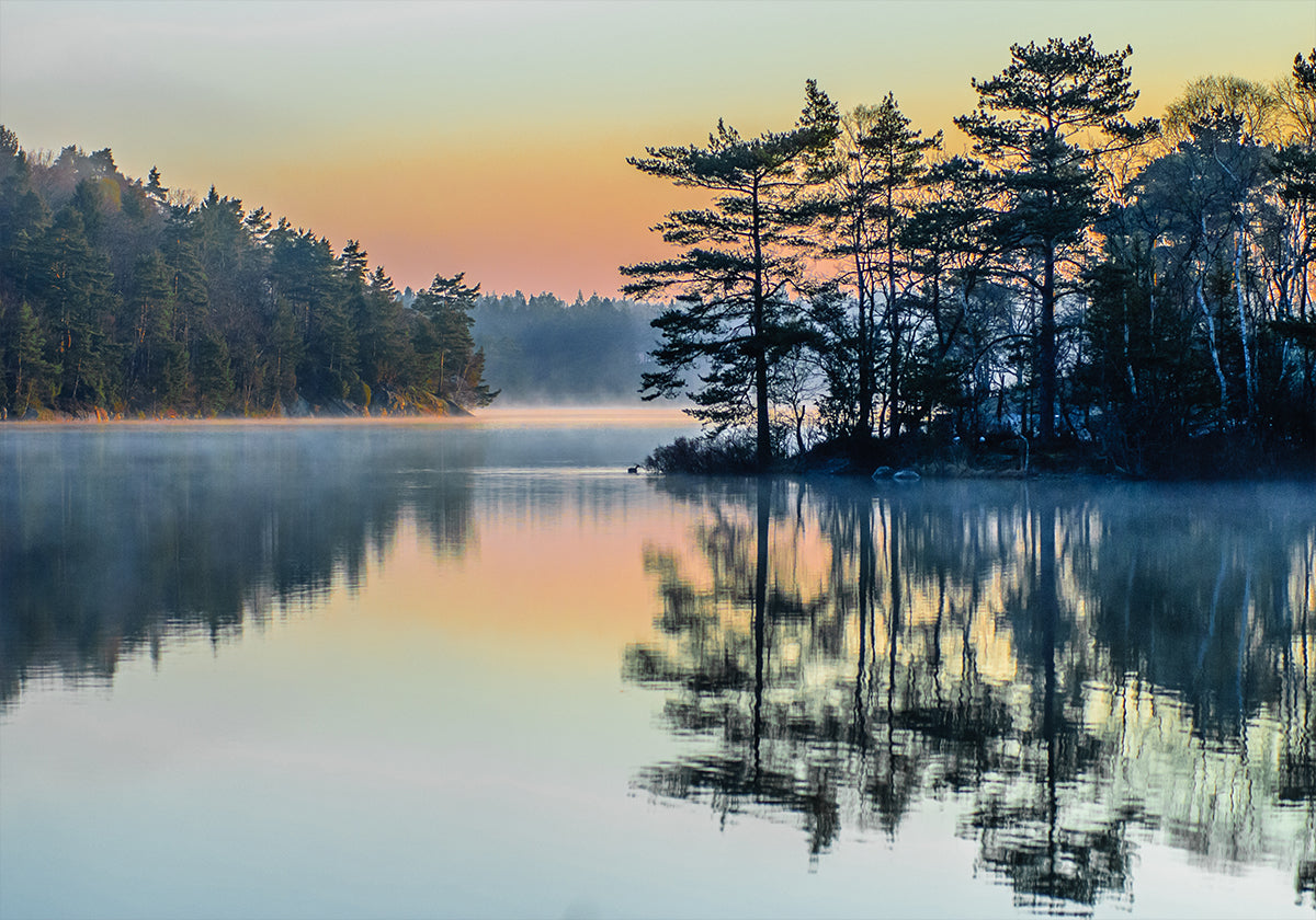 Una tranquilla scena lacustre all'alba, catturata in Svezia con la nebbia che si alza sull'acqua immobile. Il riflesso dei pini brilla nella morbida luce del sole e crea un'atmosfera calma e meditativa piena di pace e armonia.