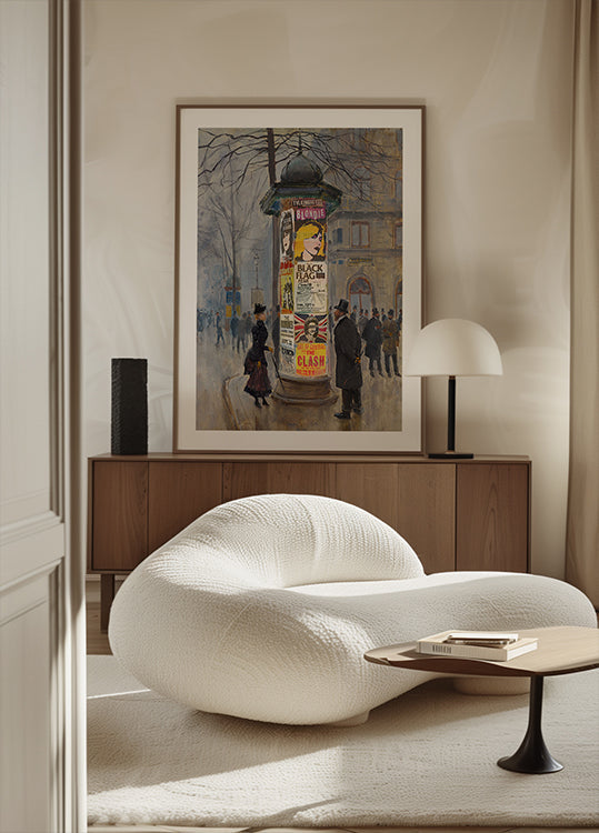 Punk Concerts forener snedækket Paris-stemning med rå street-æstetik: klassiske bygader og træer i maleriske penselstrøg møder vilde koncertplakater. Punkikoner som Sex Pistols, Ramones, Blondie og The Clash toner frem i en collage, der nikker til Monet, Van Gogh og Toulouse-Lautrec. Et drømmende møde mellem museum og rockscene.