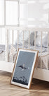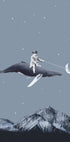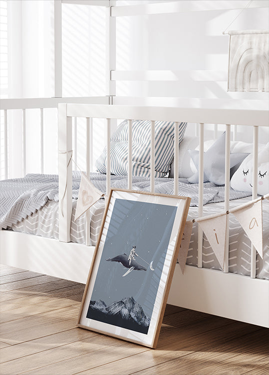 Un'opera d'arte surreale e fantasiosa raffigurante un ragazzo che cavalca una balena attraverso un cielo notturno stellato mentre controlla la falce di luna con un bastone. Sopra le montagne innevate, questa composizione da sogno cattura la meraviglia, l'immaginazione e l'immaginazione senza limiti dell'infanzia, perfetta per le camerette dei bambini e gli interni giocosi.