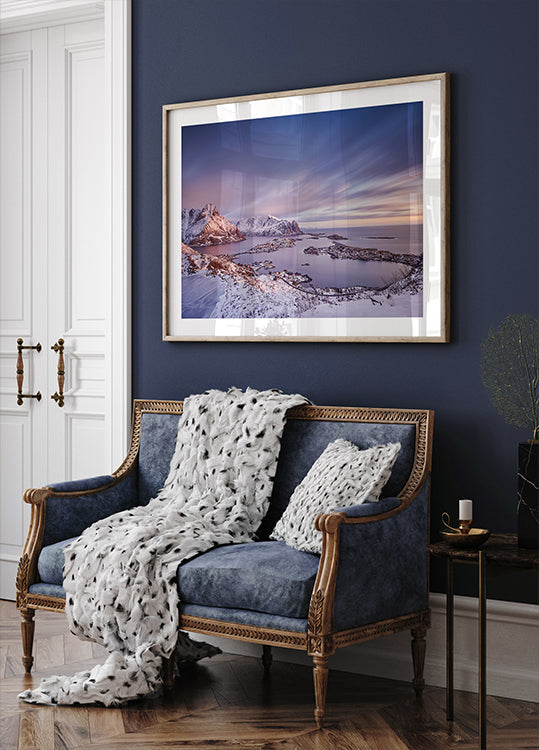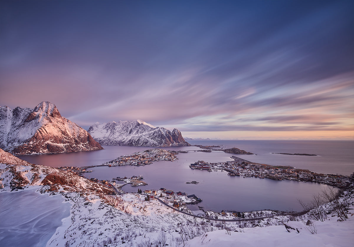 Purple Haze af Rafal R. Nebelski indfanger Lofotens dramatiske vinterlandskab i bløde violette toner. Solstråler bryder gennem skyerne over fjorde og sneklædte bjergkamme, mens havet ligger roligt for foden af de stejle sider. En stemningsfuld udsigt med nordisk poesi og dybde. Motivet leder blikket fra Reinebringen til havet.
