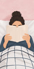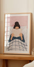 Un'illustrazione calma e accogliente di una donna che legge a letto davanti a un muro rosa chiaro. L'opera irradia calma, cura di sé e calore, ideale per camere da letto, angoli lettura e altri spazi rilassati.