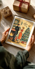 Step into a candlelit, snow-flecked evening where mid-century charm sparkles. A poised woman in a vivid red dress and a dapper gentleman linger by a shimmering Christmas tree, shop windows aglow. Painterly strokes and vintage tones wrap the scene in cozy nostalgia and festive romance. Perfect for creating a warm holiday focal point.