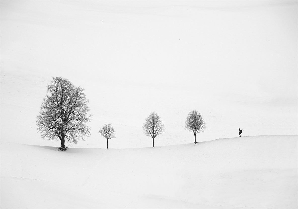 Et grafisk, højkey vintermotiv af Peter Svoboda MQEP: En enlig skiløber skærer spor i en næsten hvid, sneklædt bjergside, mens få mørke træer og konturer tegner en minimalistisk kontrast. Den monokrome komposition emmer af ro, kulde og fokus – et poetisk øjeblik i bevægelse. Motivet balancerer tomrum og struktur i et strengt, grafisk udtryk.