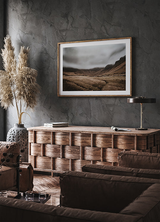 Un paesaggio spettacolare nelle Isole Faroe, con aspre colline e una vasta valle erbosa sotto una fitta coltre di nuvole basse. I toni tenui e la bellezza selvaggia evocano un senso di isolamento e di natura incontaminata, perfetto per temi come la grandiosità della natura e la tranquillità remota.
