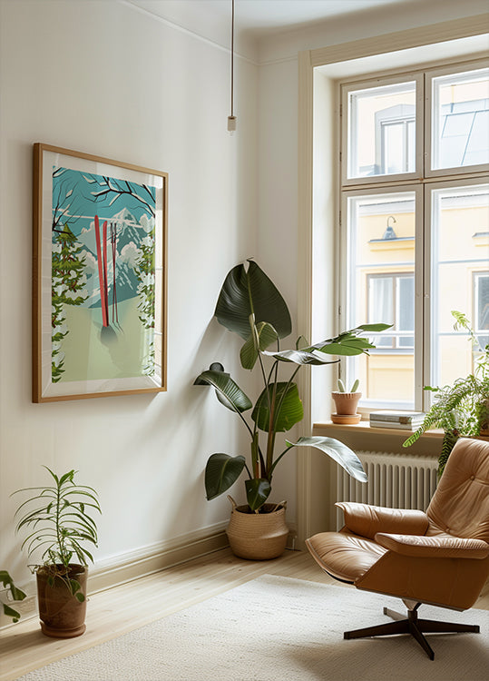 Una scena invernale vivace e stilizzata di Nicholas: uno sciatore si trova sulla cima di una montagna che domina cime innevate e abeti scuri, mentre sottili fiocchi di neve cadono nell'aria limpida e fredda. Il motivo emana un senso di avventura e l'atmosfera classica dei poster di viaggio alpino: energico, nostalgico e pieno di movimento. Perfetto per gli spiriti invernali e il piacere dello sci.