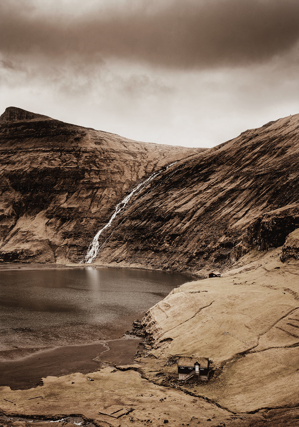Un'immagine tranquilla e rustica di una casa isolata situata in riva a un lago calmo, con una cascata scrosciante sullo sfondo. I toni tenui e il cielo drammatico creano un'atmosfera calma ma malinconica.