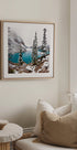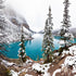 Dyk ind i vinterroen ved Moraine Lake: snepudrede tinder spejler sig i turkis, stille vand, mens mørke graner rammer udsigten ind. Den nøgterne palet af hvid, blå og grøn forstærker følelsen af klar, kølig luft. Skabt af kunstneren Matt Crowell, der fanger naturens storslåede stilhed. Et tidløst blik over de Canadiske Rockies.