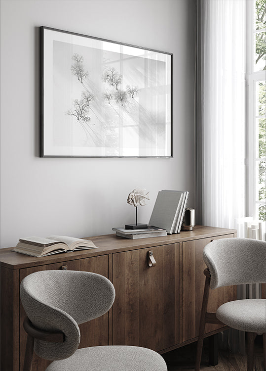 Sogno invernale – un balletto tranquillo di LINGLING GUAN raffigura un tranquillo paesaggio invernale, dove la neve si deposita come un velo leggero attorno agli alberi sottili. Toni tenui e luci soffuse e fredde creano una calma poetica che invita alla contemplazione: un balletto visivo di silenzio ed eleganza. Perfetto per portare in salotto la poesia dell'inverno.