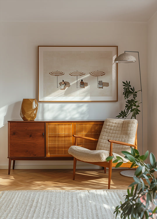 Un'illustrazione semplice e calma con tre ombrelloni a righe e due persone sedute su lettini prendisole su una spiaggia luminosa. I colori tenui e la composizione rilassata creano una sensazione di tranquillità estiva e di atmosfera mediterranea. Perfetta per cottage estivi, case moderne o pareti-galleria.